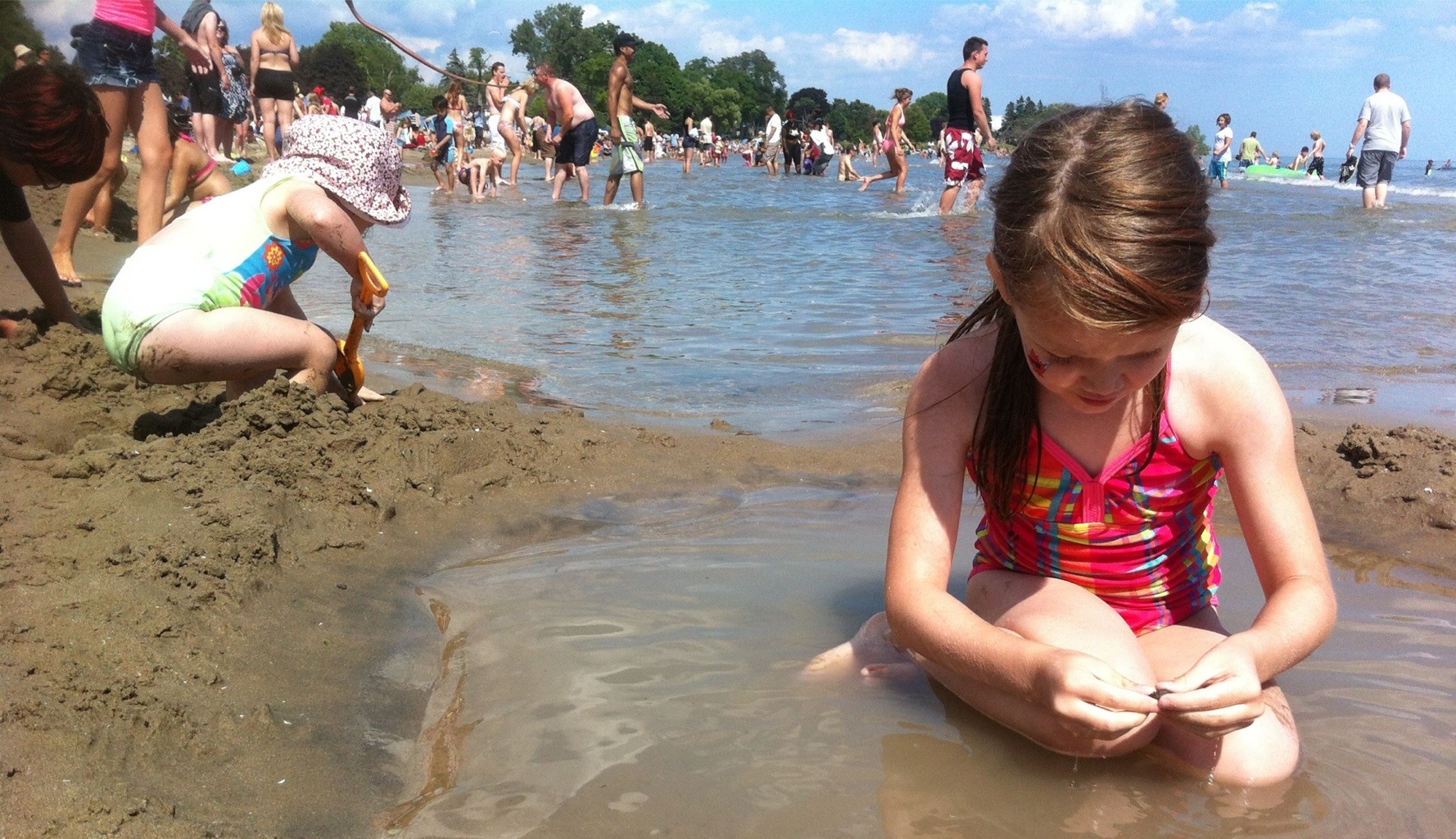 Medea and Tanit play at the beach on Canada Day in Cobourg, ON.