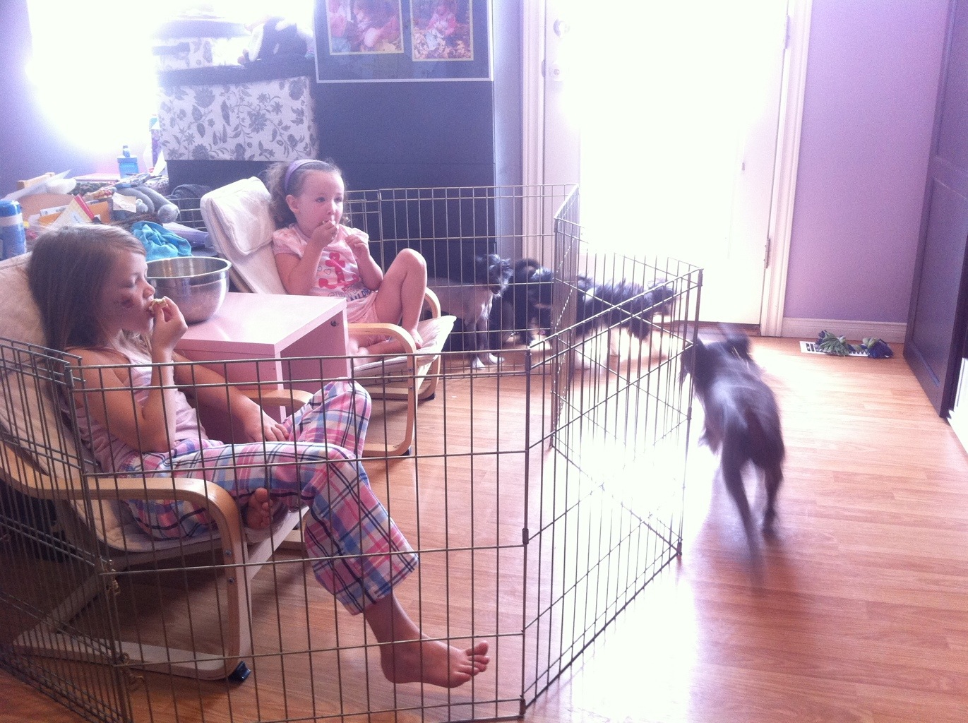 Medea and Tanit munch popcorn – protected from the hungry Jelly Hoard.