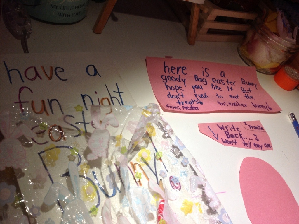 Medea made a beautiful collection of goodies for the Easter Bunny: a lovely card, a bunny made from a toilet paper roll (very creative), a Canada pencil and a couple of notes.