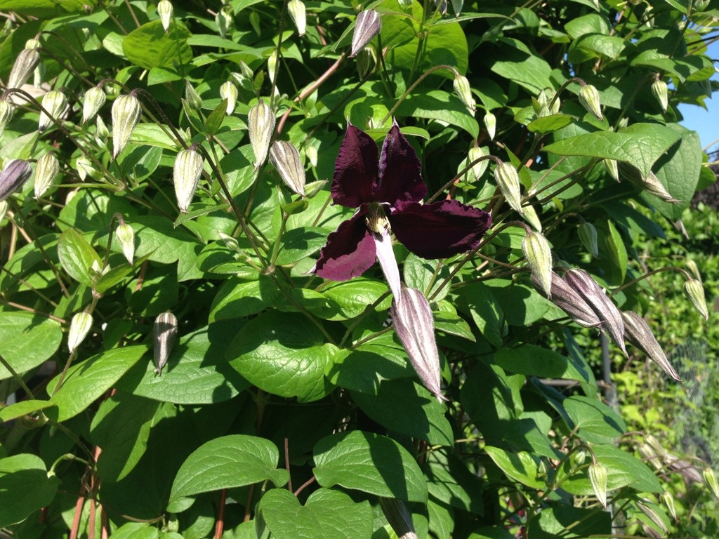 A couple of Clematis flowers (of the zillion buds) are almost open on the arbor today.