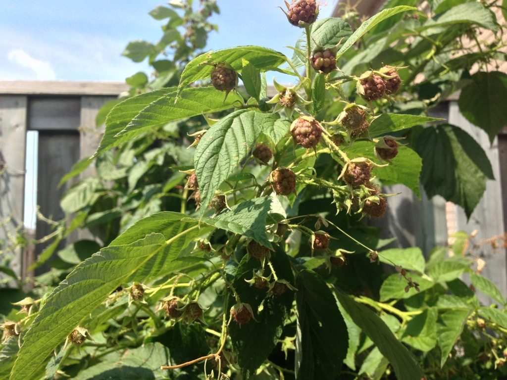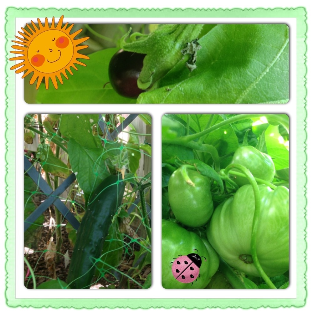 There are some lovely veggies on their way in our garden. Today I checked in and saw an abundance of tomatoes growing big, a few cucumbers (much bigger than yesterday), and our first eggplant! The raspberries should be on their way soon too!
