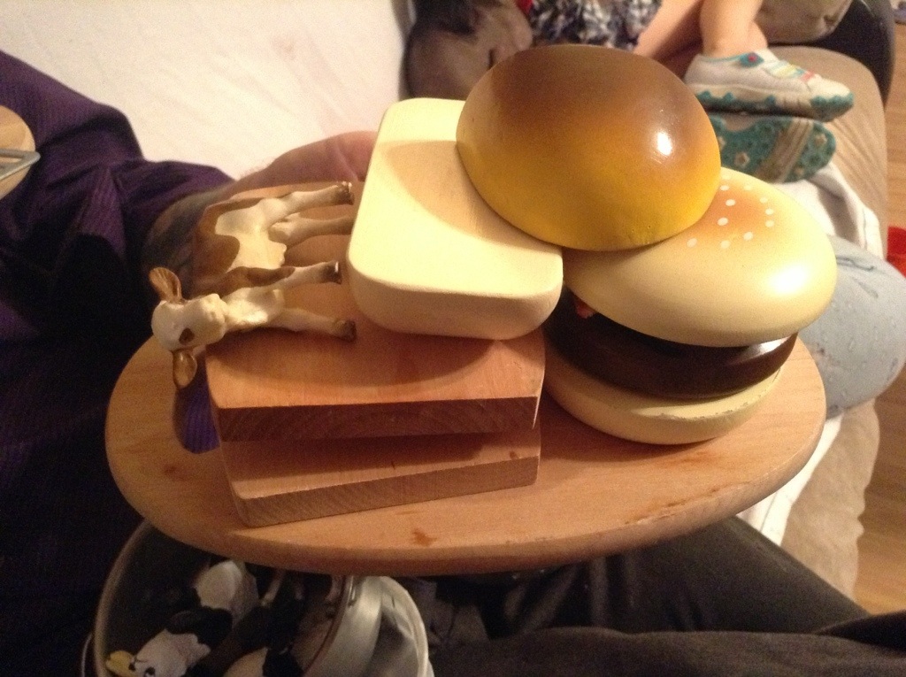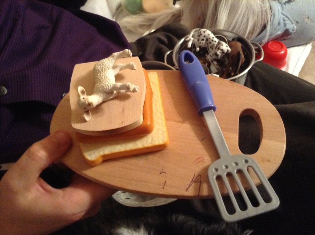 Dead lamb waffle bread and spatula to cut the dead lamb and Camel burger With a cow and tomato sandwich!